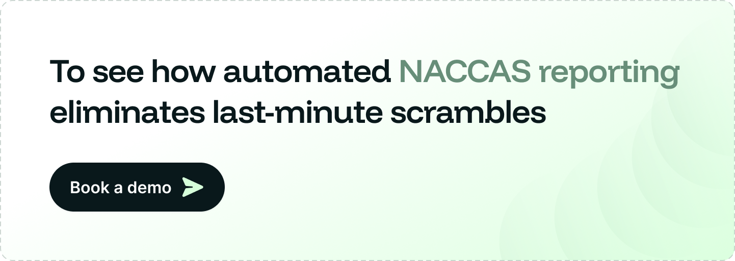 Bella AI maintains continuous NACCAS data collection throughout the year: enrollment dates, completion dates, withdrawal reasons, and placement information populate automatically as events occur. When Annual Report deadlines approach, administrators generate the report in NACCAS format with one click rather than reconstructing data from scattered sources.